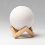 Elegante altavoz inalámbrico de diseño lunar con base realizada en madera. Función lámpara. Potencia 3W. Crea tu ambiente ideal con la luz led de diferentes posiciones, luz cálida y luz fría. Cable USB de carga incluido.